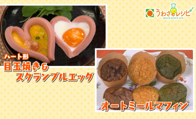 1. 「ハート形 目玉焼き&スクランブルエッグ」と「オートミールマフィン」