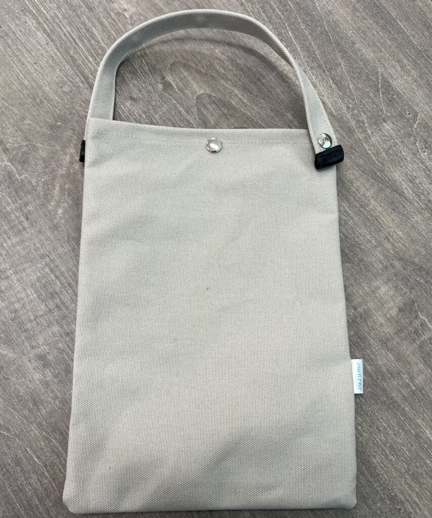 軽く糊がついた、弱撥水タイプの帆布製で、さりげない「suzume」のタグ付き。