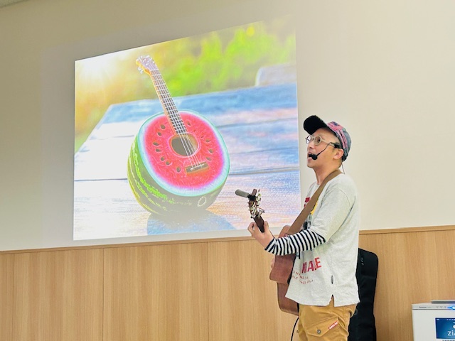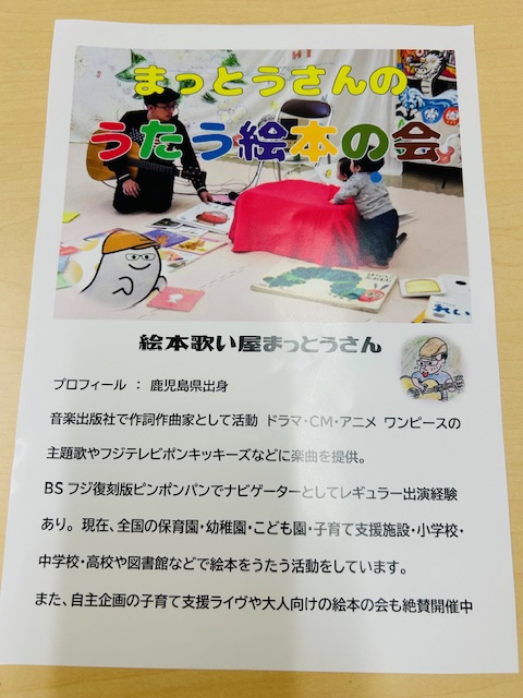 このイベントは、みんなが知っているお馴染みの絵本やオリジナルの物語に、まっとうさんが音楽を付けて、ギターを片手に演奏し歌うというもの。