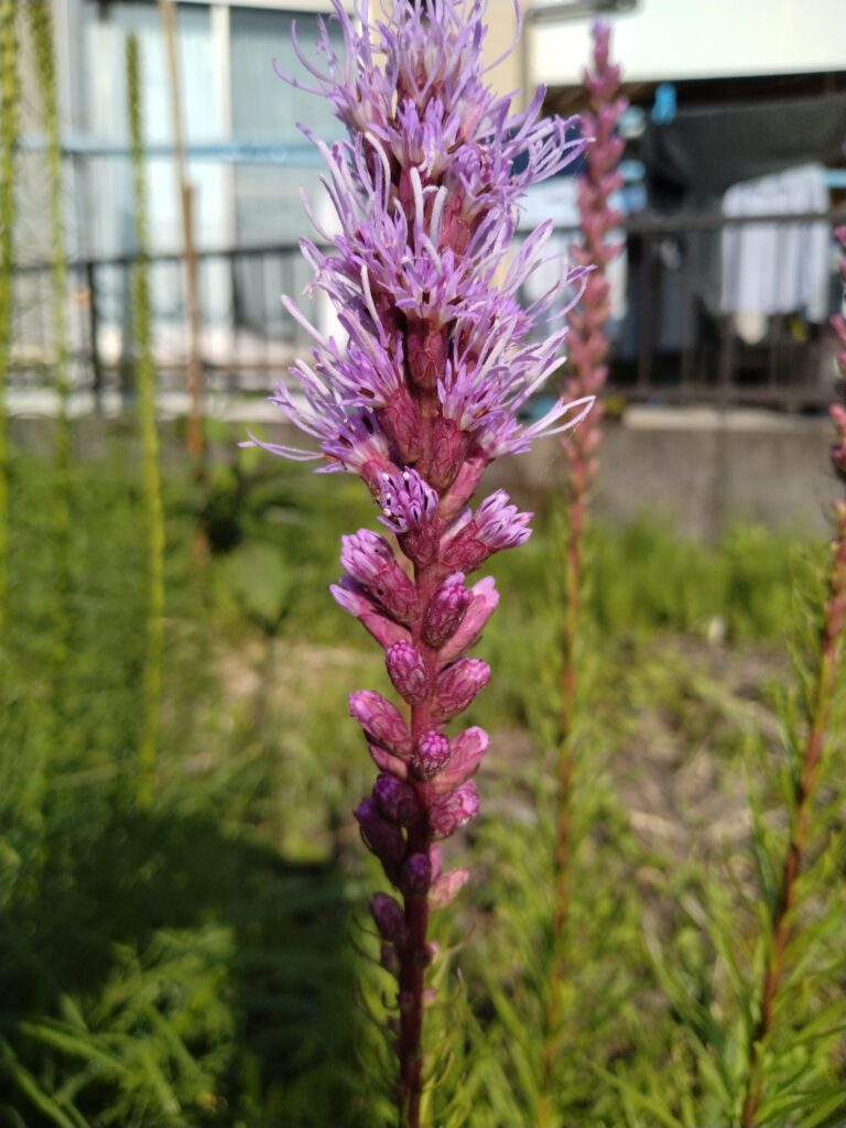 RN. 薩摩川内市ジャスミン さん今朝は朝日が眩しく、まだ田植えされてない水田に反射してきれいでした。リアトリスが徐々に開花してきました。紫の色が朝日に映えます。