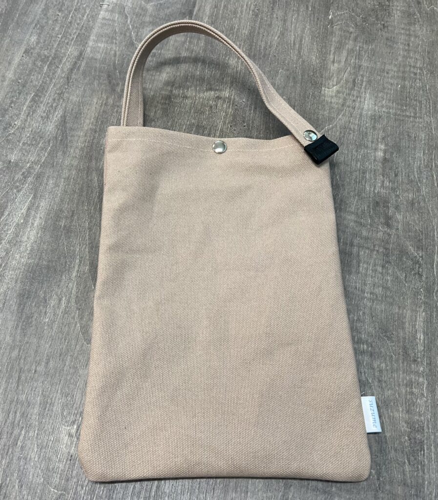 軽く糊がついた、弱撥水タイプの帆布製で、さりげない「suzume」のタグ付き。