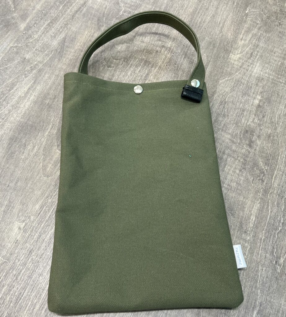軽く糊がついた、弱撥水タイプの帆布製で、さりげない「suzume」のタグ付き。