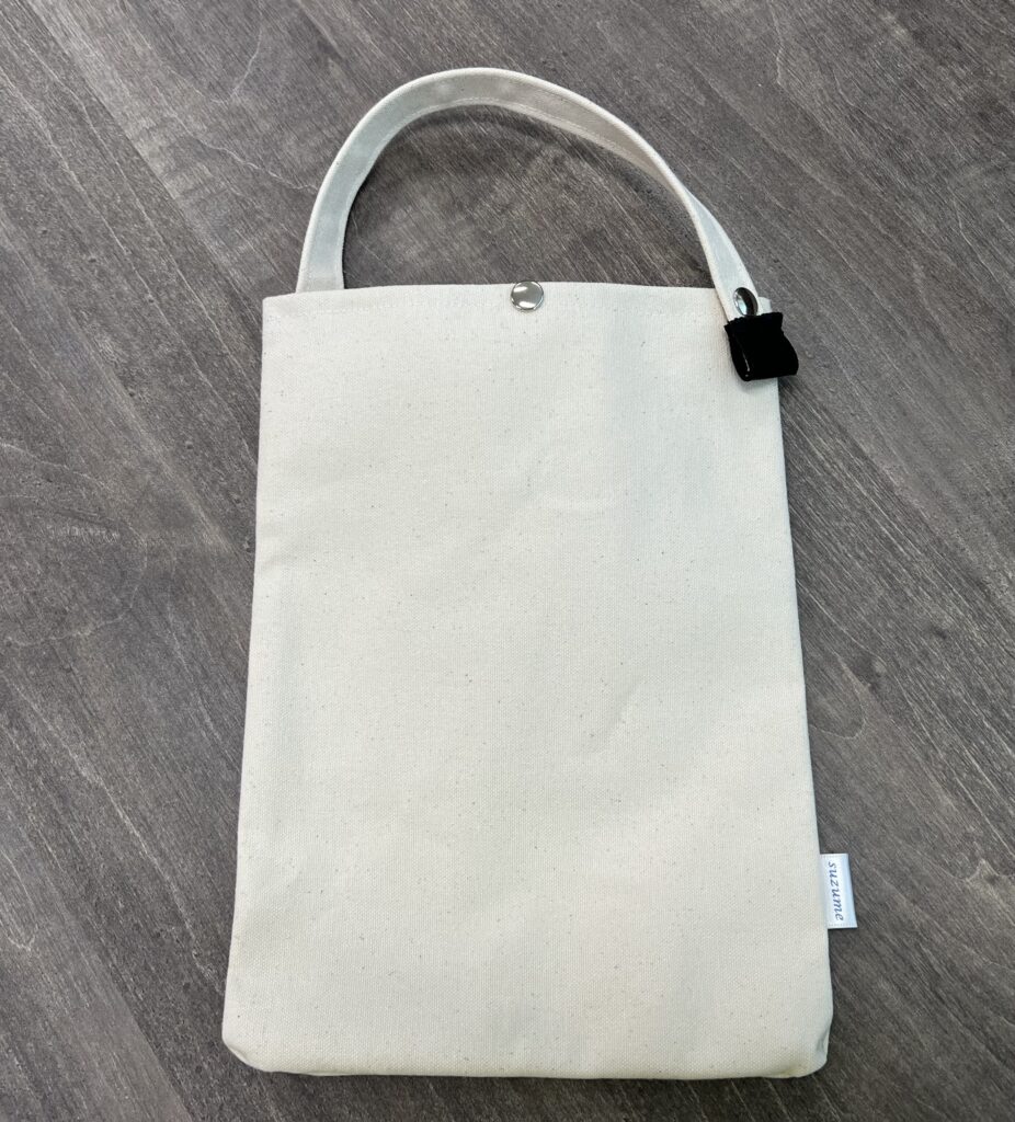 軽く糊がついた、弱撥水タイプの帆布製で、さりげない「suzume」のタグ付き。