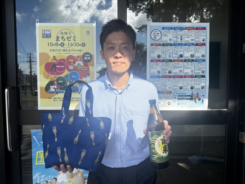 プレゼントは、南種子まちゼミ事務局から「畳の縁で作ったオリジナルバック(山田タタミ店)