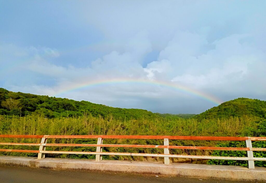 仕事に向かう途中、田んぼにかかる橋から、虹の架け橋を見つけました