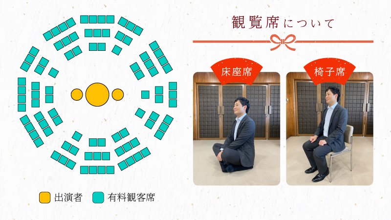 観覧席も同様に床に座る形式となり、出演者と目線が同じ高さで、距離も近く、臨場感あふれるお席となります。床に座る席には、座布団などをご用意いたします。床に座るのが難しい方には、後方にはなりますが、椅子席をご用意いたしますのでご了承ください。