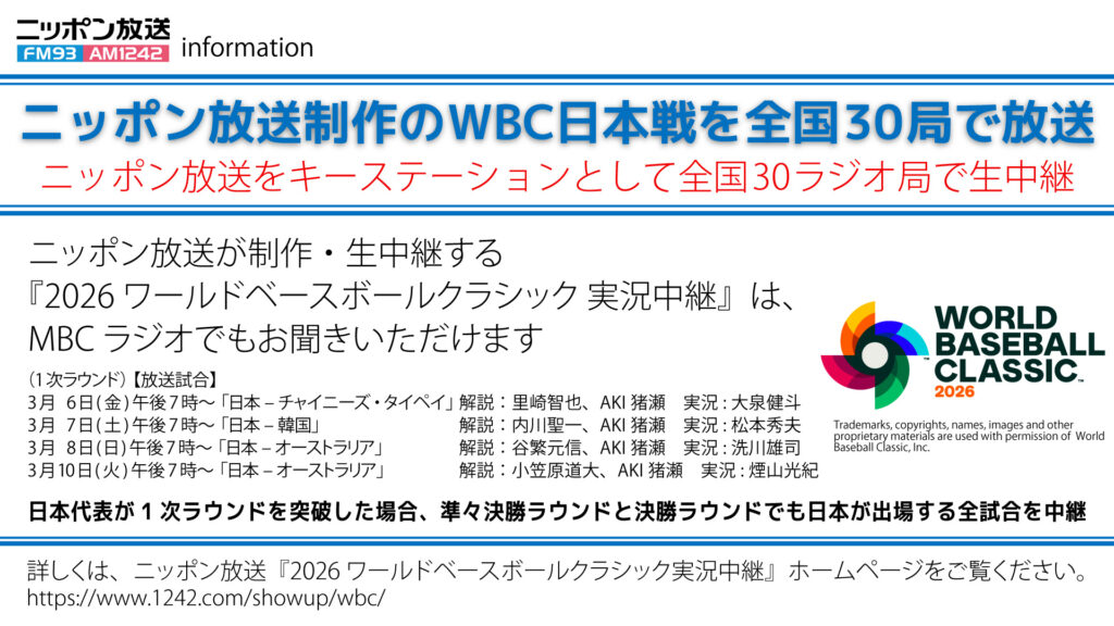 詳しくは、ニッポン放送『2026 ワールドベースボールクラシック 実況中継』ホームページ(https://www.1242.com/showup/wbc/)をご覧ください。