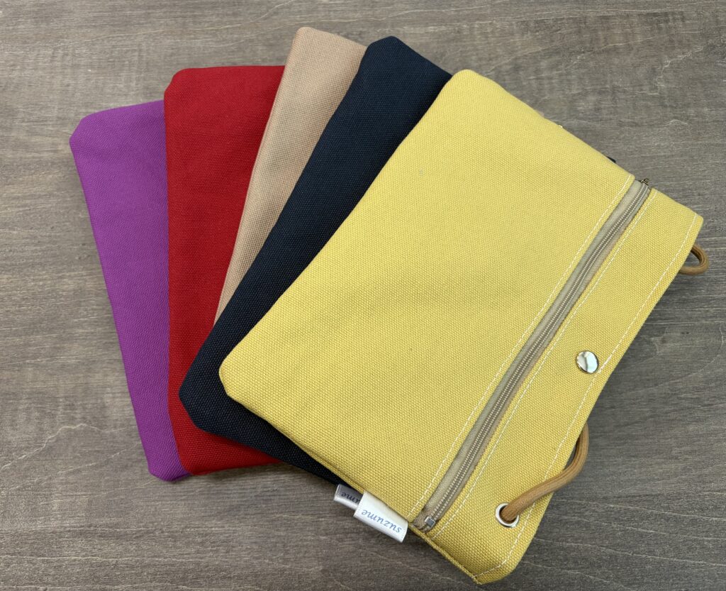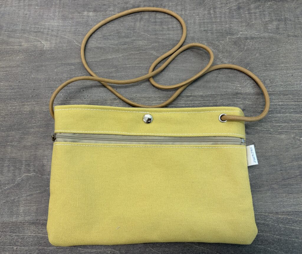 軽く糊がついた、弱撥水タイプの帆布製で、さりげない「suzume」のタグ付き。