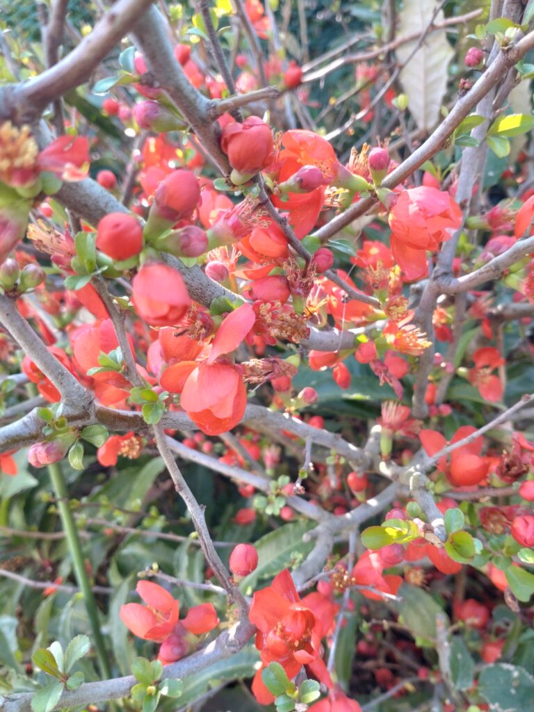 RN. にゃんバラ さん明け方のお月様がきれいでしたよ〜空気が澄んでいたせいかなぁ〜お日さまが当たる所は体感はぽかぽかです〜(写真も頂きました)えっちゃんの好きなボケの花ですよ〜♡庭の