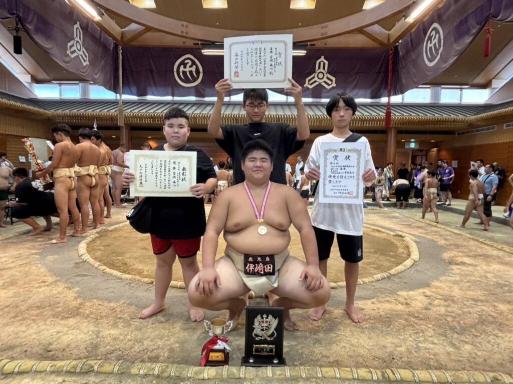 宮崎県で8月5日(火)6日(水)に行われた九州中学総体の相撲競技。個人の部では志布志市伊﨑田中学校3年の菅間奏心さん(伊﨑田相撲クラブ)が決勝で福岡県代表の小野颯真さん(遠賀相撲教室)を寄り切りで破り優勝しました。