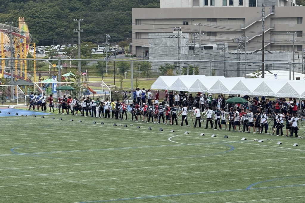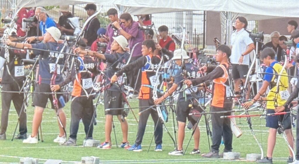 山口県で行われているインターハイのアーチェリー競技。きょうは団体予選が行われました。3人で行われる男子団体に出場した県代表の串木野高校(中袴田 羚・3年 中袴田 遊・1年 本田 高大・2年)は全体9位で上位16チームで行われる決勝トーナメントへの進出を決めました。