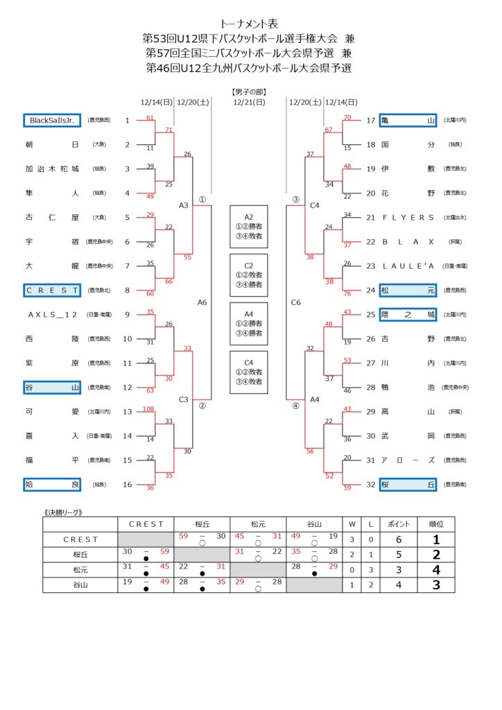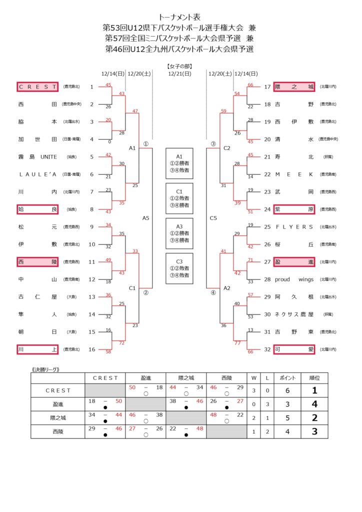 なお、この大会は「全九州バスケットボール大会」の予選も兼ねており、県大会の2~4位チーム、男子:桜丘・谷山・松元、女子:隈之城・西陵・盈進が推薦される予定です。