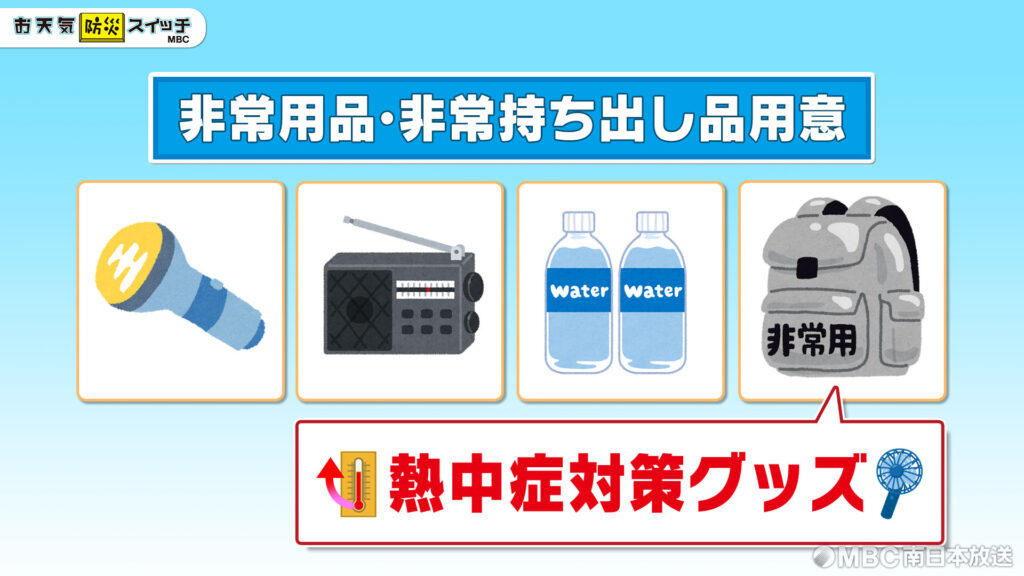 梅雨、夏は厳しい暑さの中、避難所で過ごすことになるかもしれませんので、熱中症対策に冷却グッズなどあると役立つかもしれません。