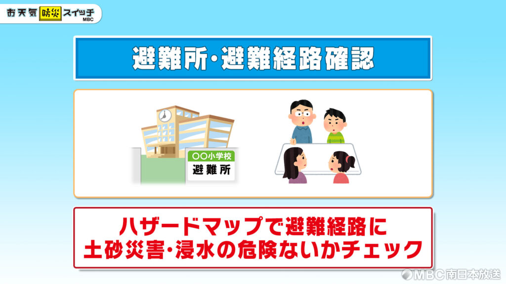 ぜひ一度ハザードマップを確認して、避難ルートに土砂災害や浸水の危険がないかチェックしてみて、そこを通らないようにしましょう。実際に歩いてみるのもいいかもしれません。そして、家族のみなさんなどと、どこに避難するかや連絡方法を確認しておくと安心です。