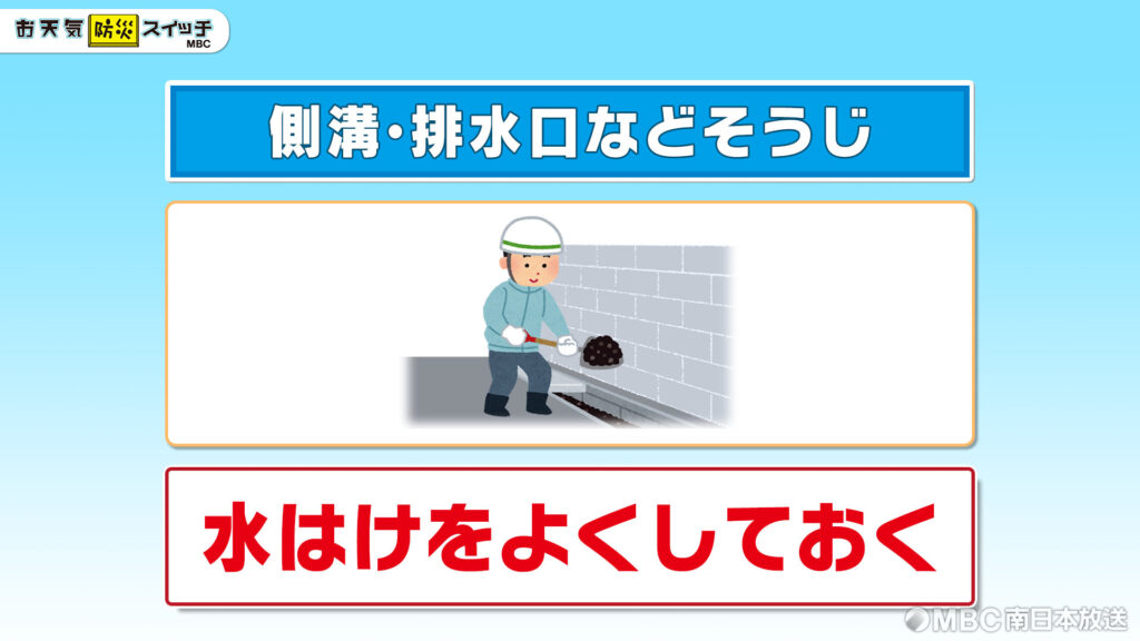 三つ目、側溝や排水口などをそうじして、水はけをよくしておきましょう。