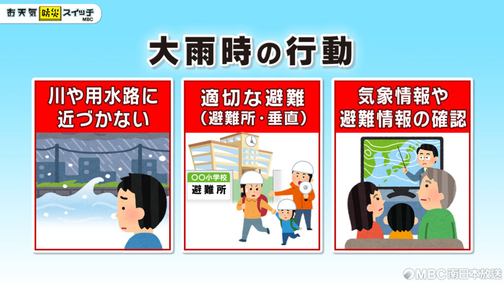 まずは、大雨で川が増水しますので、川や用水路には絶対に近づかないでください。