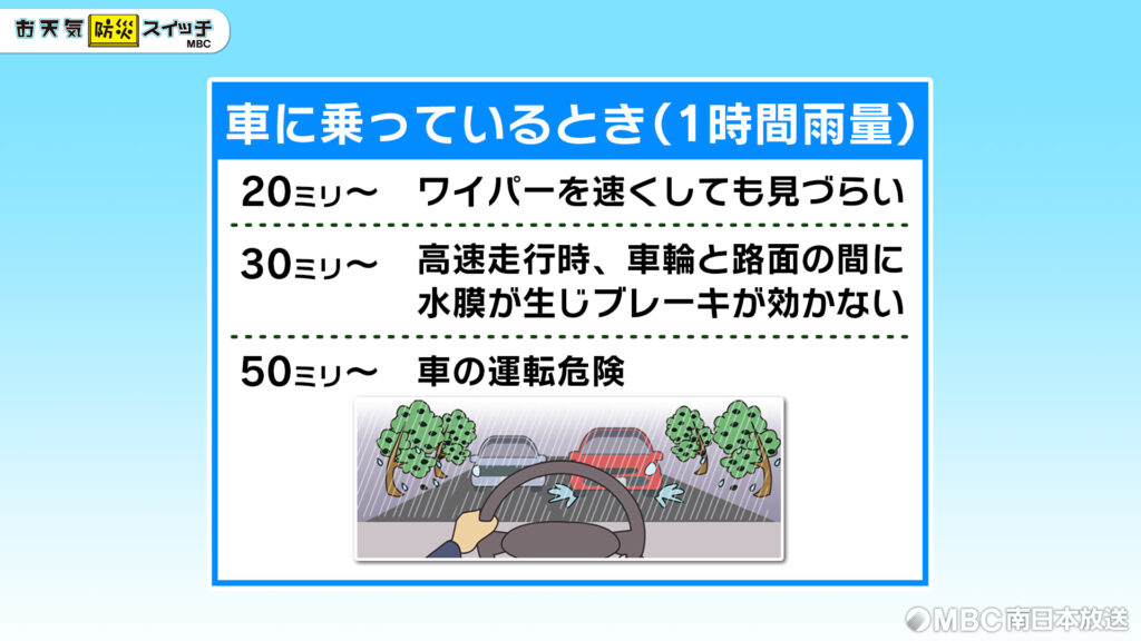 1時間に50ミリ以上の雨では車の運転は危険、となっています。