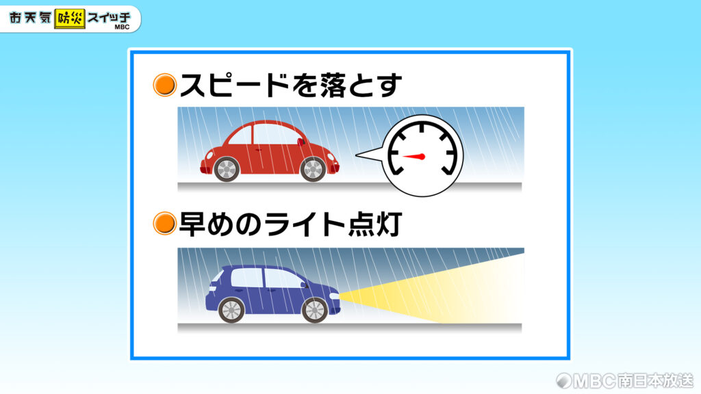 大雨のときには、スピードを出しすぎず車間距離を十分にとり、日中でもライトを点灯しましょう。