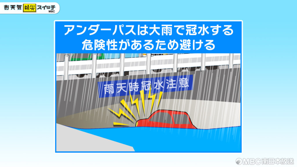 アンダーパスは大雨で冠水し、車が水没する危険性があります。エンジンが停止したりドアが開かなくなって車内に閉じ込められる恐れがありますので、大雨の時にはアンダーパスは避けましょう。