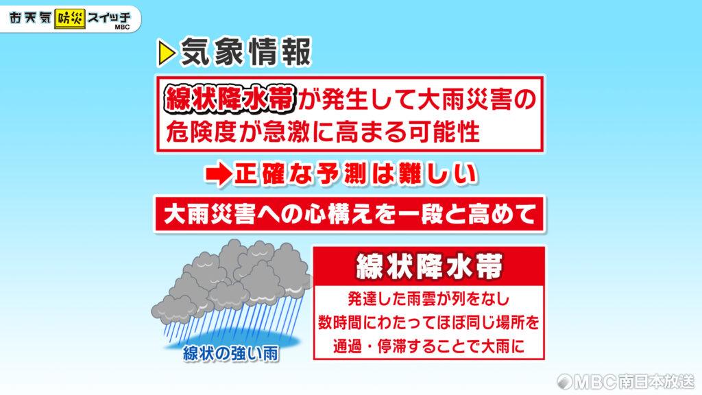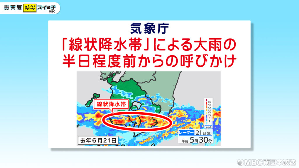 気象庁は線状降水帯による大雨の可能性がある場合、半日程度前から「線状降水帯」というキーワードを使って呼びかけます。
