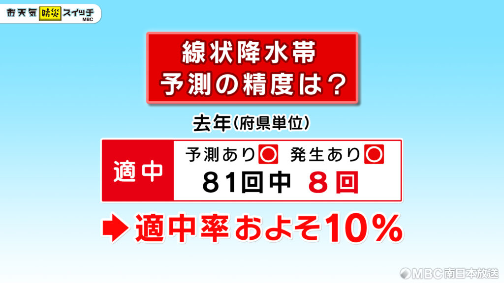 気象庁によりますと、去年の府県単位での発表の的中率はおよそ10%。全国で見ると81回中8回です。