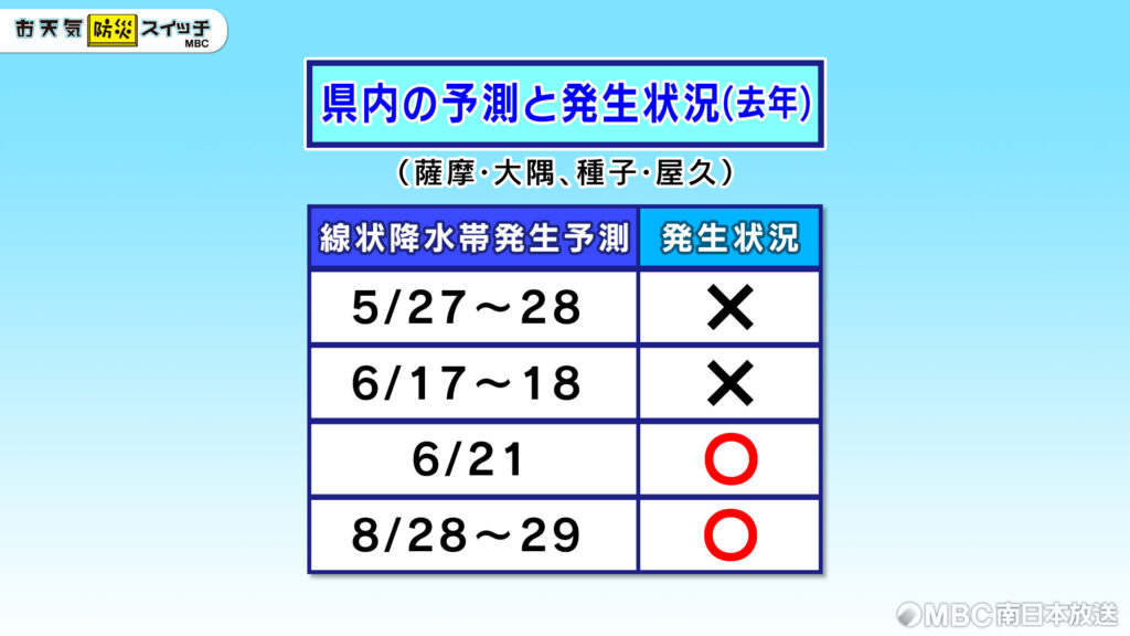 県内に限ってみると2024年、薩摩・大隅、種子・屋久地方に4回予測が発表されて、そのうち2回は実際に発生しました。2024年6月は梅雨前線、8月は台風によるものでした。