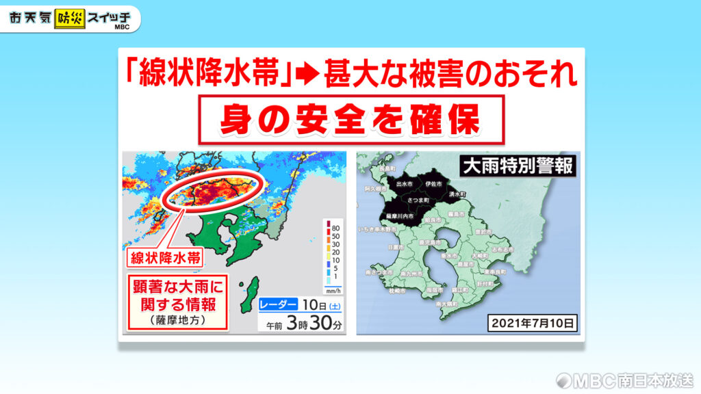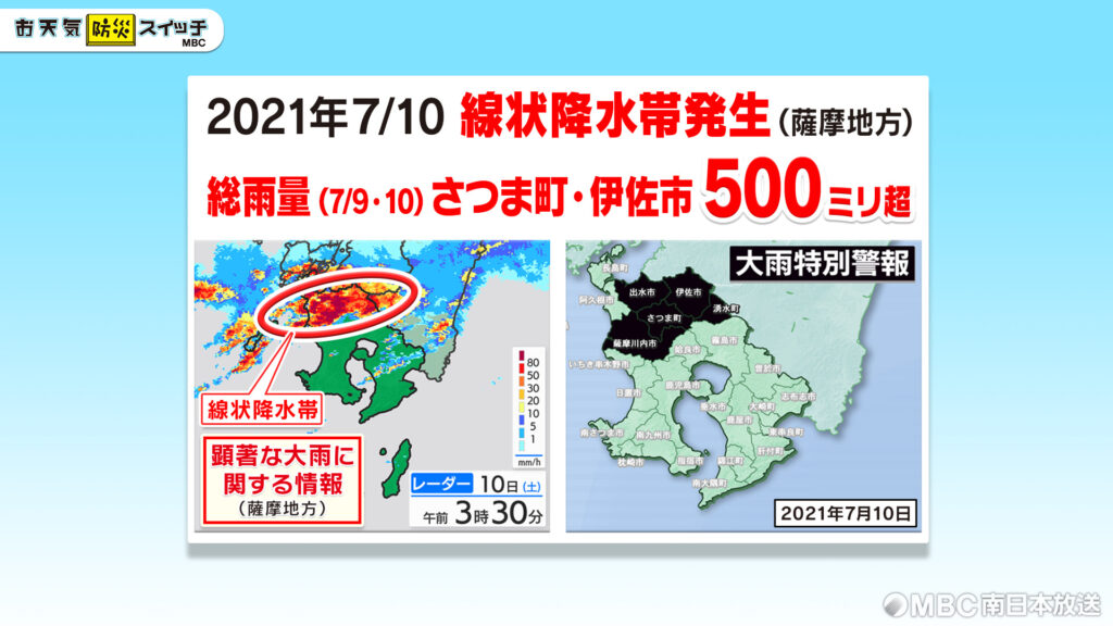 2021年7月10日、薩摩地方北部に線状降水帯が発生し大雨になり、5つの市と町(出水市、伊佐市、湧水町、さつま町、薩摩川内市)に大雨特別警報が発表されました。