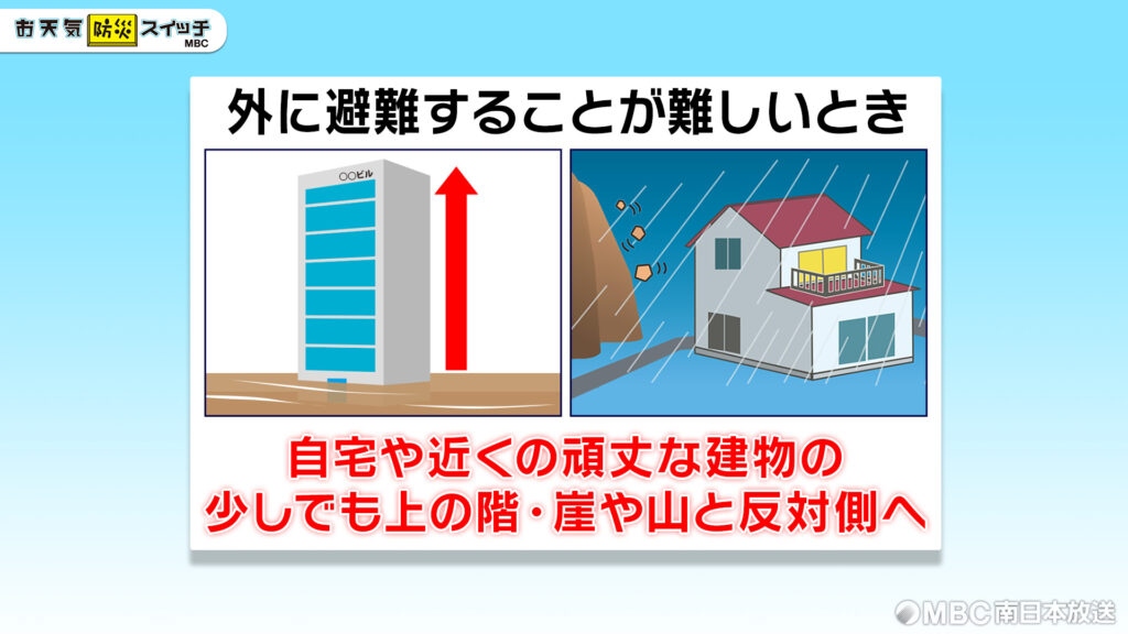 避難場所への避難がかえって危険な場合は、浸水しにくい高い場所、崖から離れた建物など近くの安全な場所へ移動をしましょう。