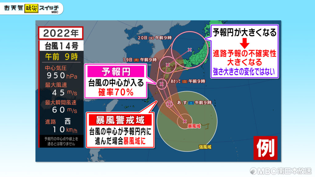次に予想です。予報円は台風の中心が進むと予想される範囲でこの円の中に台風が入る確率は70%です。