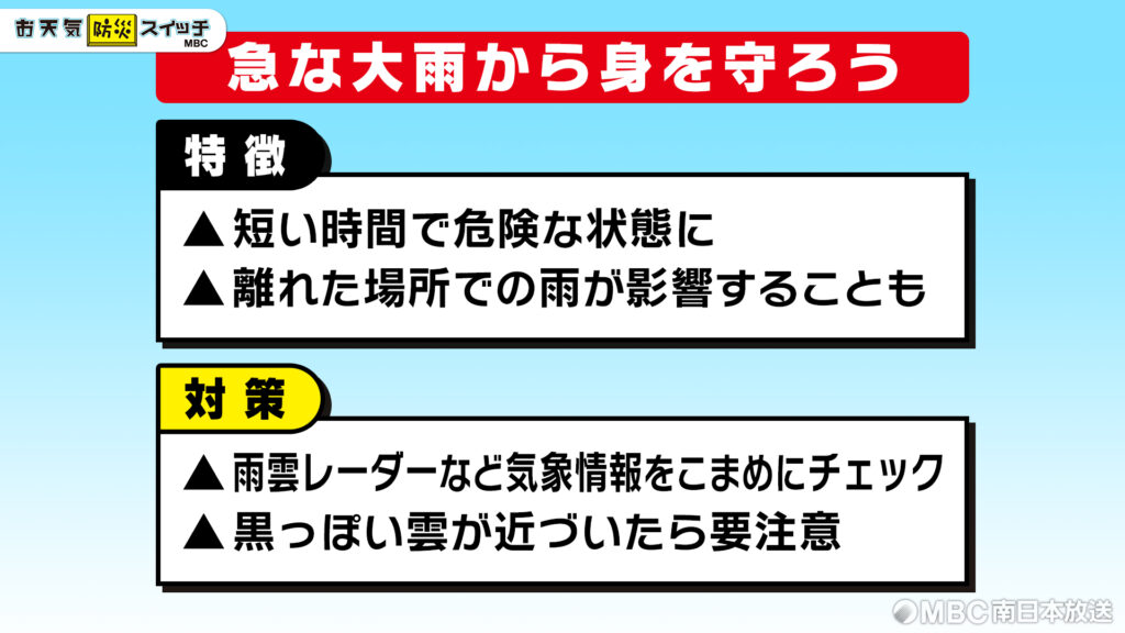 26日は「急な大雨から身を守ろう」と題してお伝えします。夏場になると天気が急変して、突然大雨が降ることがあります。最近ではゲリラ豪雨ともいわれます。