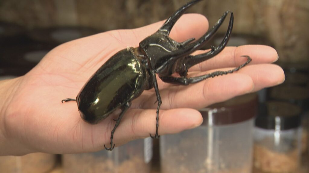 珍しい生き物と触れ合える移動動物園に夏のイベントを前に飼育されている世界のカブトムシ。
