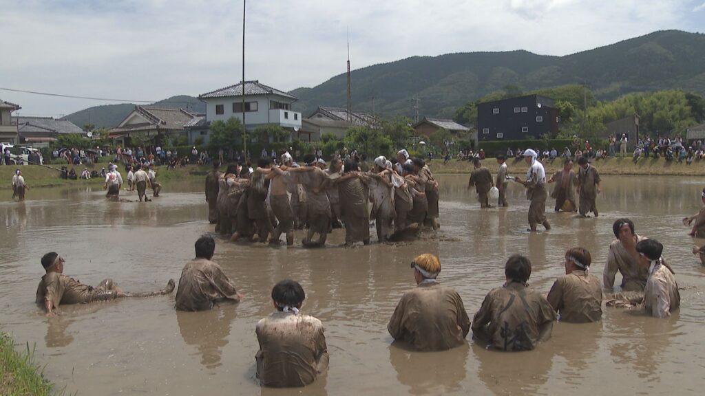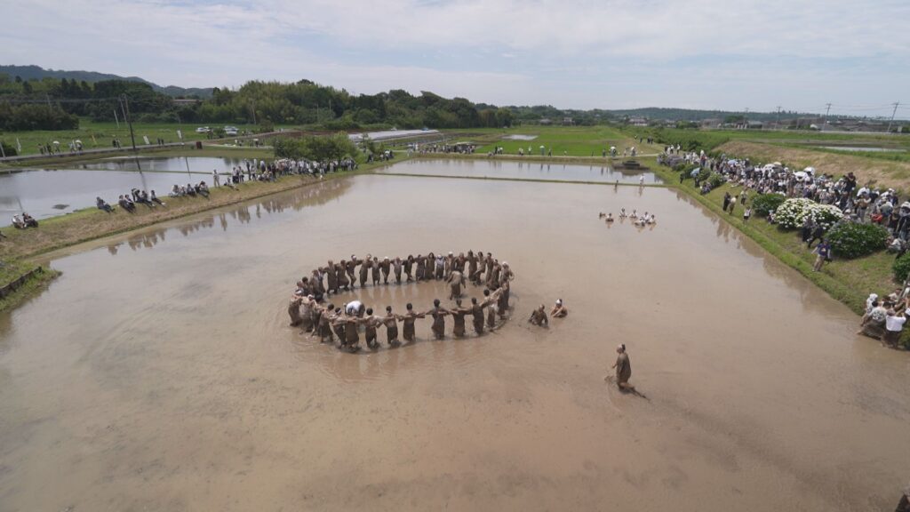 円陣を組み、高らかに歌い、田んぼの土を耕すがごとく泥だらけになるまで飛び跳ね、今年一年の豊作を祈願する。