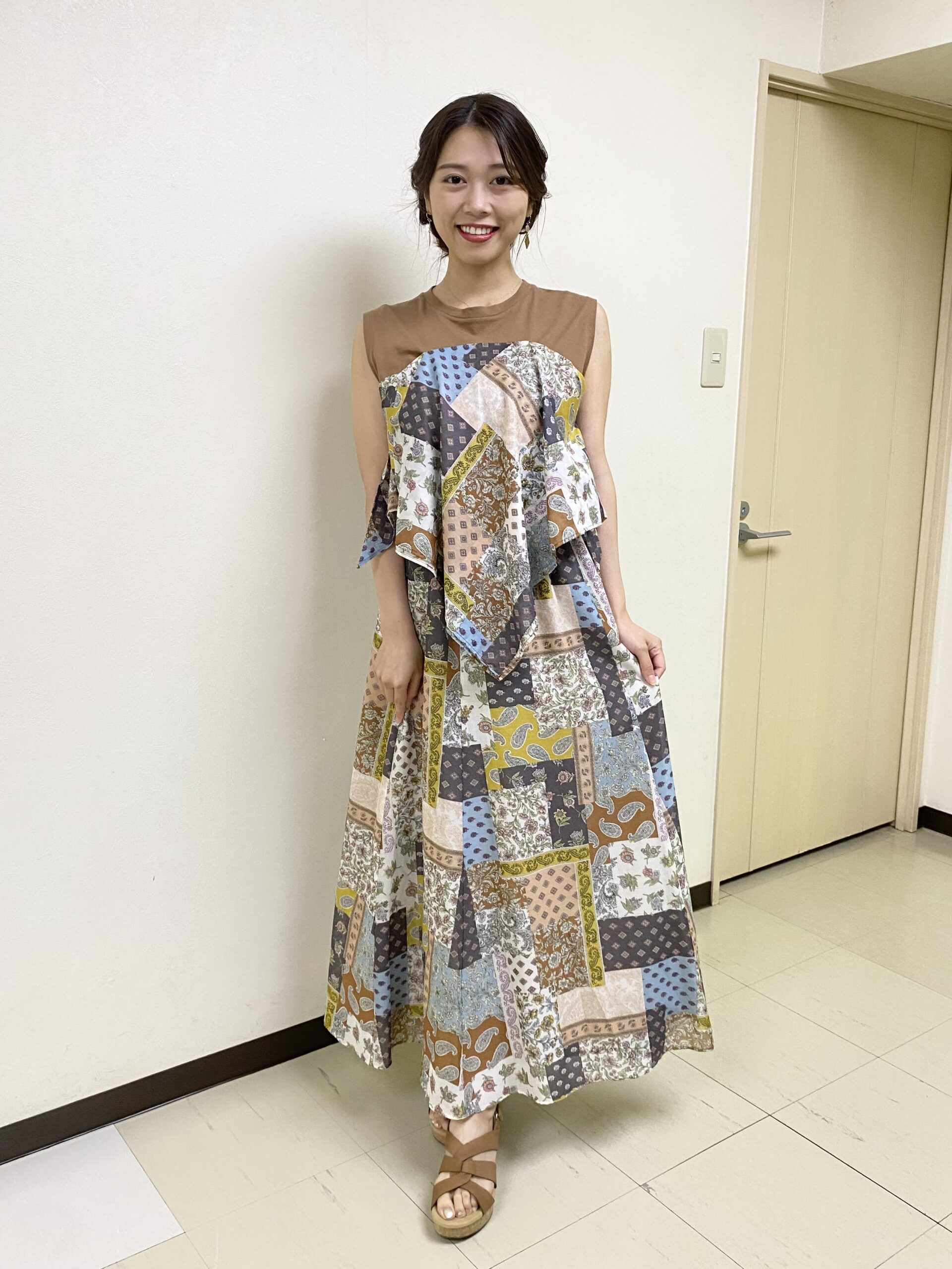 温かみのあるブラウンの部分と、カラフルなボヘミアン柄の組み合わせが印象的なトップス🤎