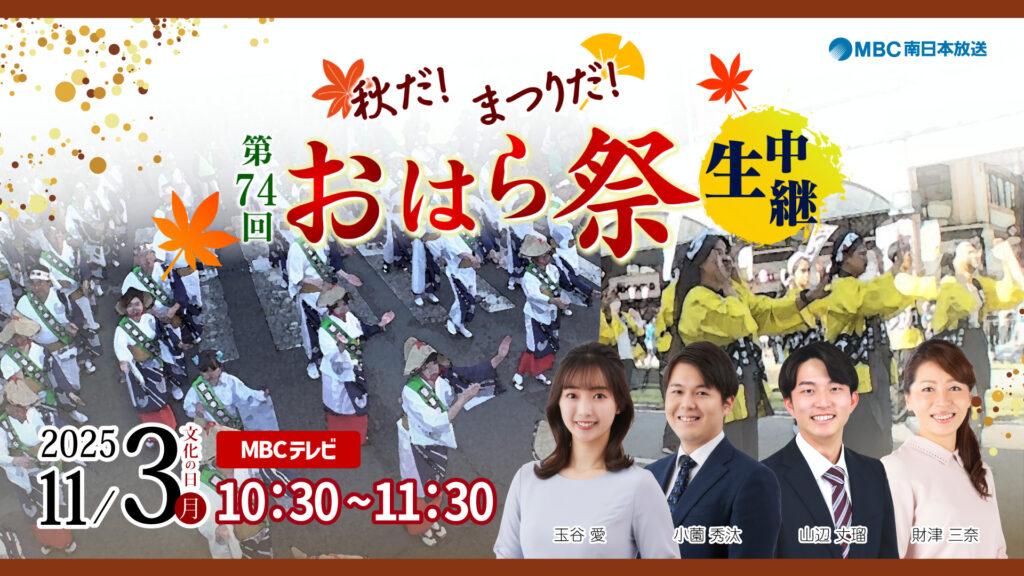 番組では、本まつり・第1部の「総踊り」を中心に、「おごじょ太鼓」の競演などを会場から生中継でお伝えします。