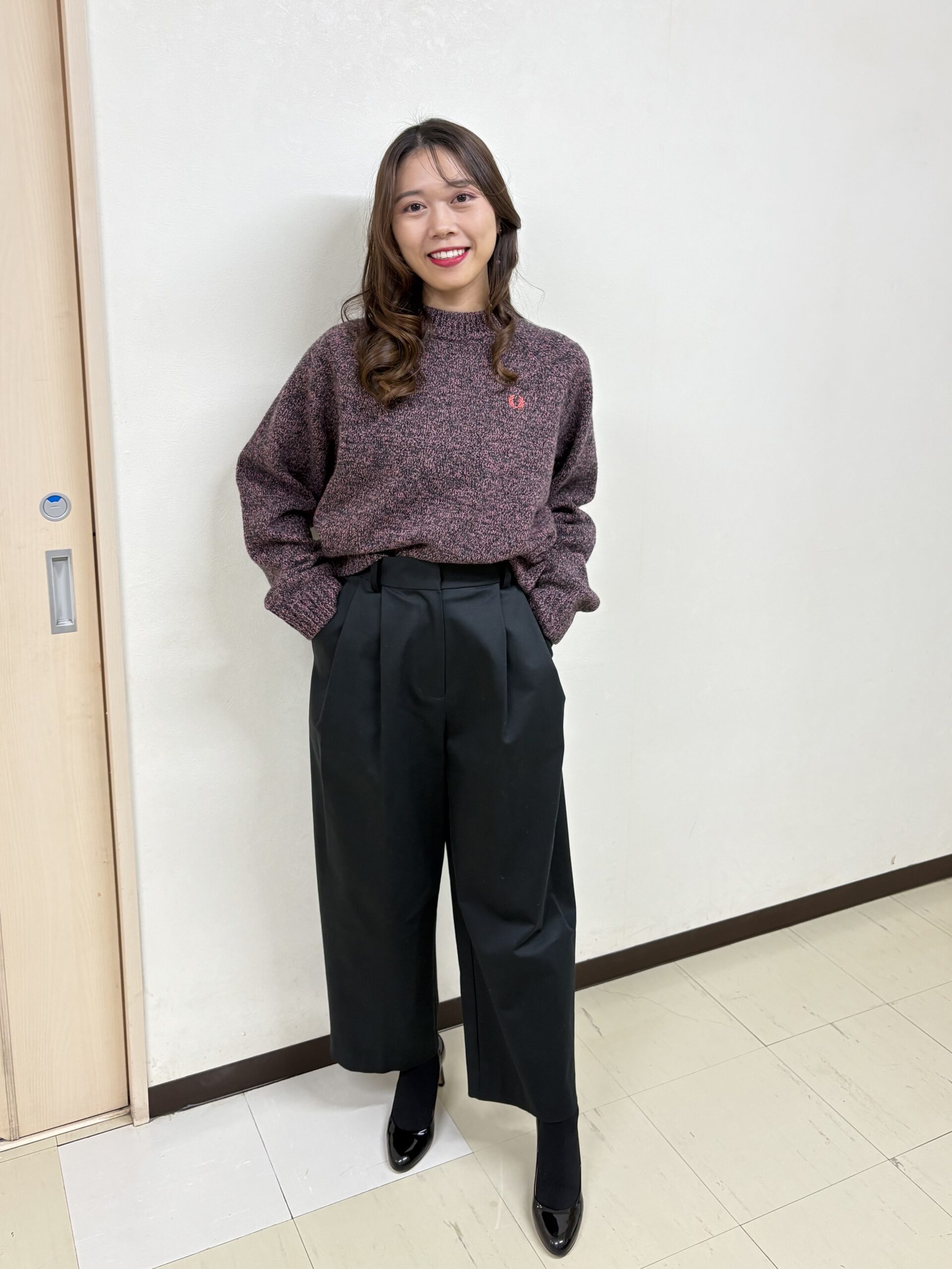 ハイウエストのバレル型のようなパンツ。ハリがあり、センタープレスになっていて形も綺麗!