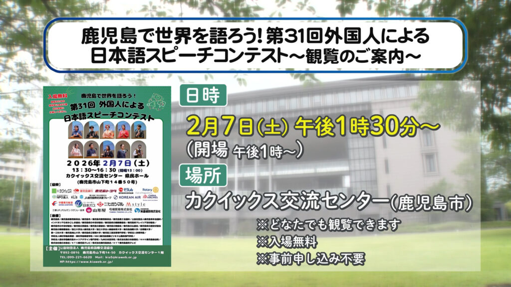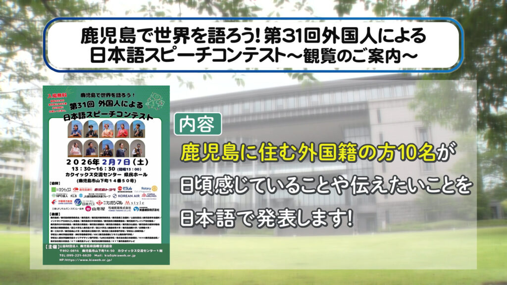 鹿児島で世界を語ろう!第31回外国人による日本語スピーチコンテスト~観覧のご案内~ ほか