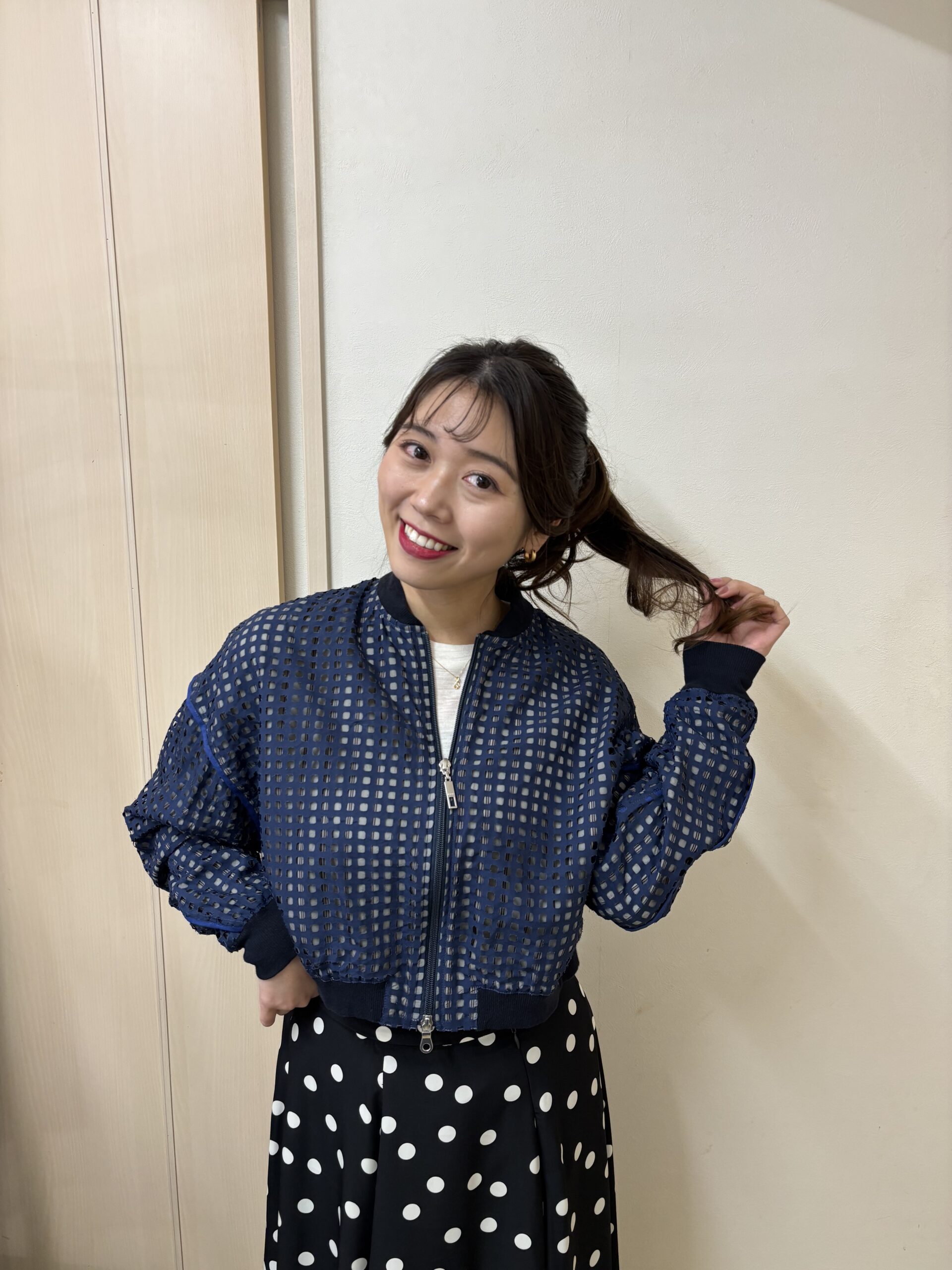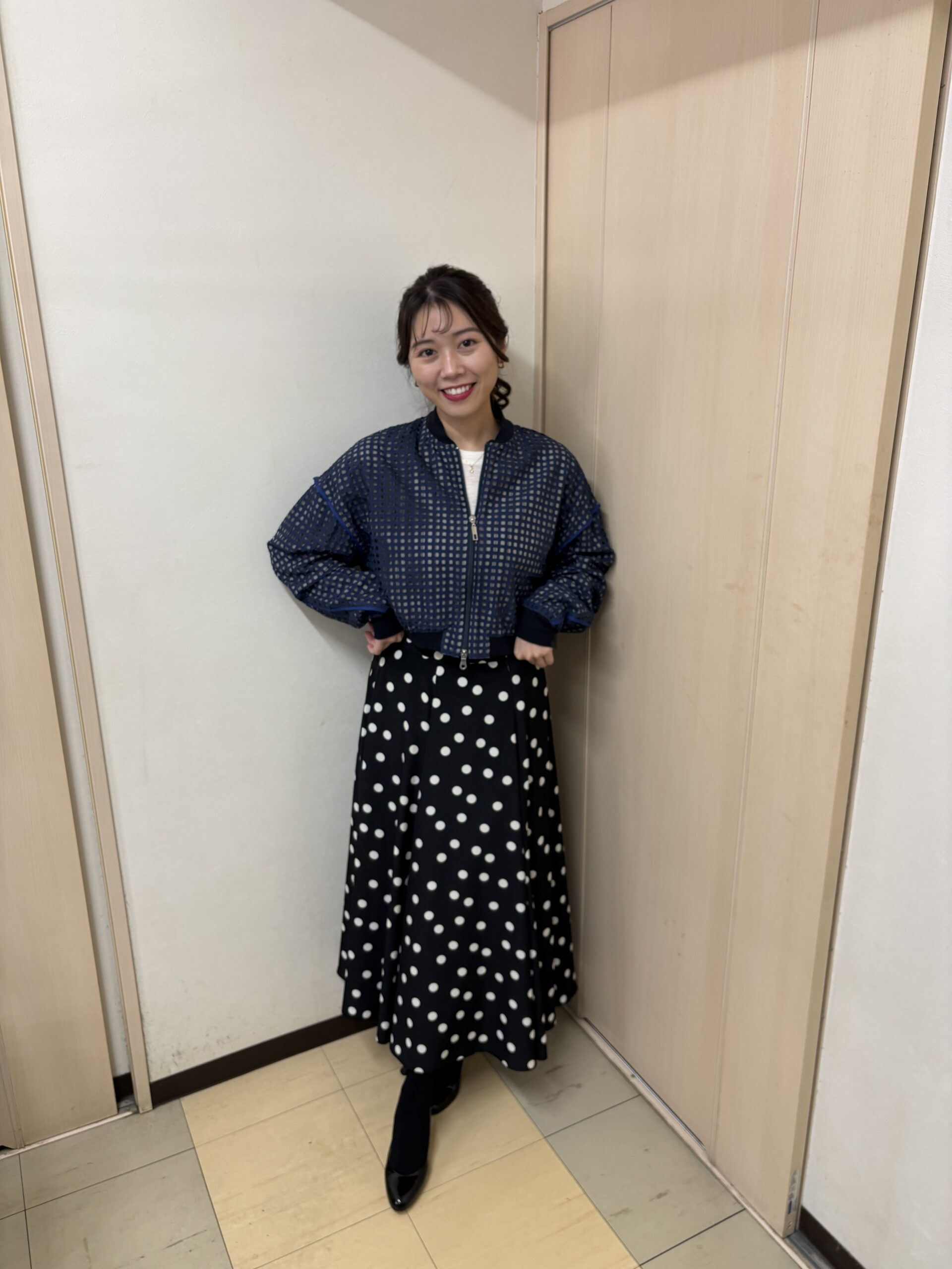 黒地に白のドット柄が可愛いスカート。光沢のある素材で一枚でとっても華やか✨