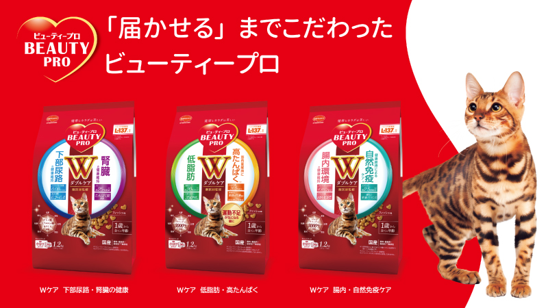 国産プレミアムキャットフード「ビューティープロ キャット」は、うるおいと栄養を「届かせる」までこだわります。「Wケア」シリーズは猫ちゃんの気になるポイントに配慮し、1粒で2つの健康をサポート。