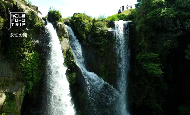 町を流れる南方川にある滝で、落差は21メートル。地域住民の有志が整備した永江ん滝公園からその姿をゆっくり眺めることができます。田園風景の中で勢いよく水が流れ落ちる滝の姿を上空から眺める旅へと案内します。