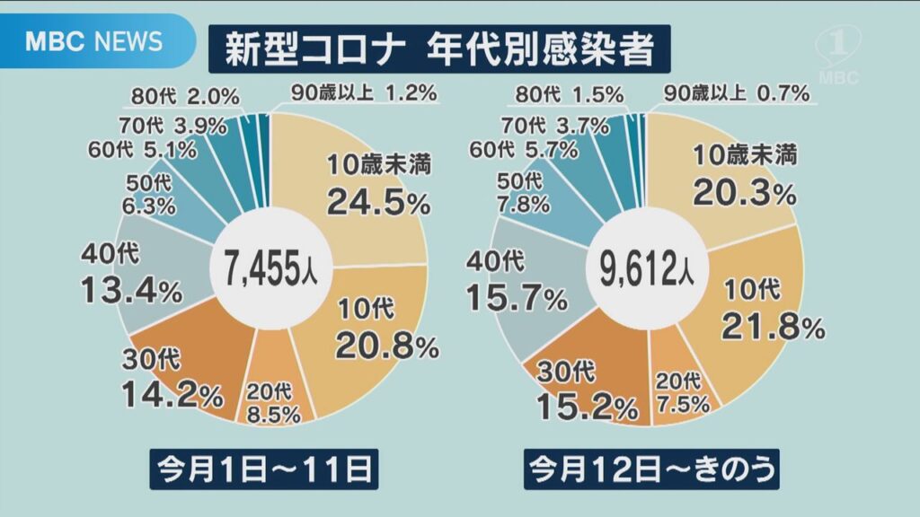 1日あたりの感染者数が初めて1500人を超えた今月12日以降の感染者を年代別に見ると、10歳未満は感染者数自体は増えているもの、割合は20.3%と、以前と比べて4ポイントほど下回っています。