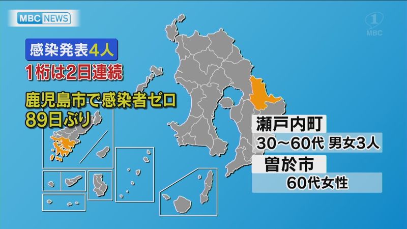 新たに確認された感染者は、瀬戸内町の30代から60代の男女3人と曽於市の60代女性のあわせて4人です。1日の感染者1桁は2日連続です。