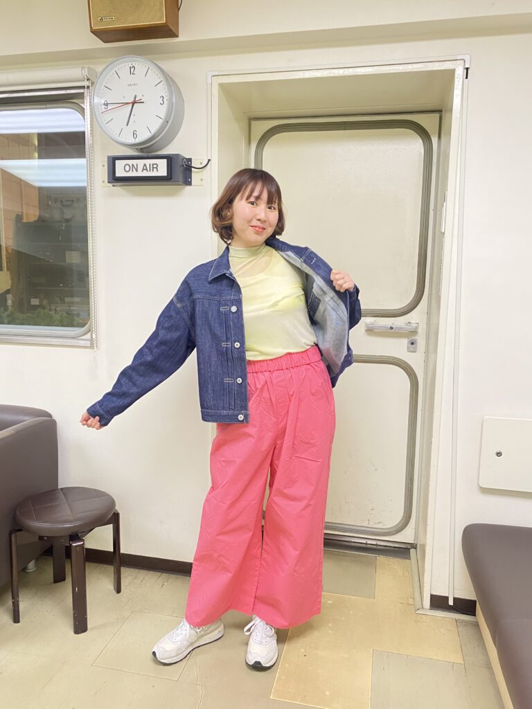 濃いめの紺色なので、どのカラーにも合わせやすいですし、パンツにもスカートにも