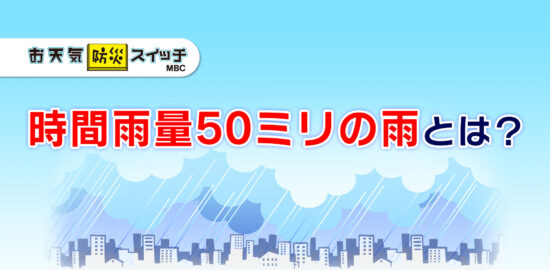 お天気防災スイッチです。今回ははこの時期によく耳にする「時間雨量50ミリの雨」についてお伝…