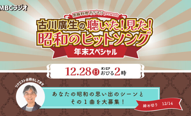 12月28日(日) お昼2時から年末スペシャル特番がオンエア決定!みなさんの昭和の思い出のシーンをリクエスト曲と共にお送りします。現在、リクエスト曲を大募集!下記リクエストフォーム・FAX・ハガキで受け付けています。…