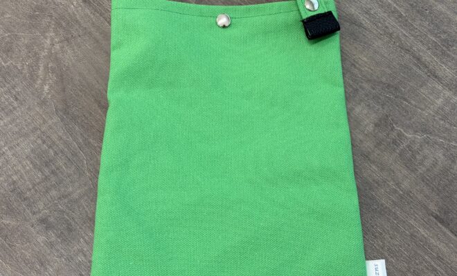 ほぼA4サイズの縦型ワンハンドルバッグです。 持ち手が着脱可能な片側ボタン止めになっているので他のバッグの持ち手につけて使うこともできます。軽く糊がついた、弱撥水タイプの帆布製で、さりげない「suzume」のタグ…