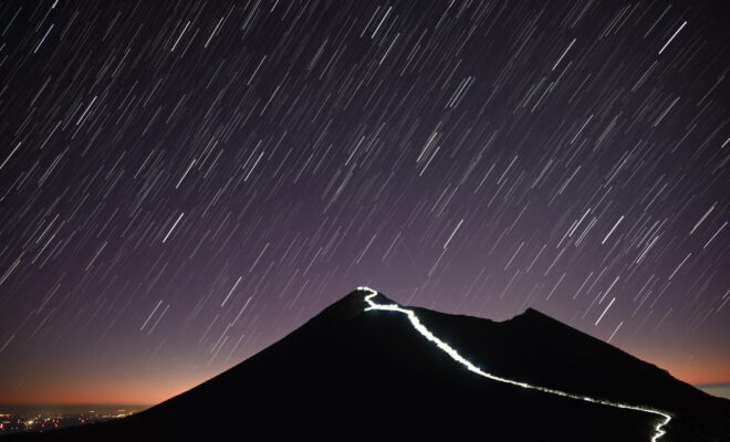 RN. ドカバイさん大晦日から霧島連山の高千穂峰へご来光登山のヘッドライトの帯を撮影に行きました。中岳登山道の中腹で、そこから先は新燃岳の立入禁止の手前の高千穂の峰が全体が見える場所陣取りして3時〜撮影開始、4時前後からは続々山頂を目指し…