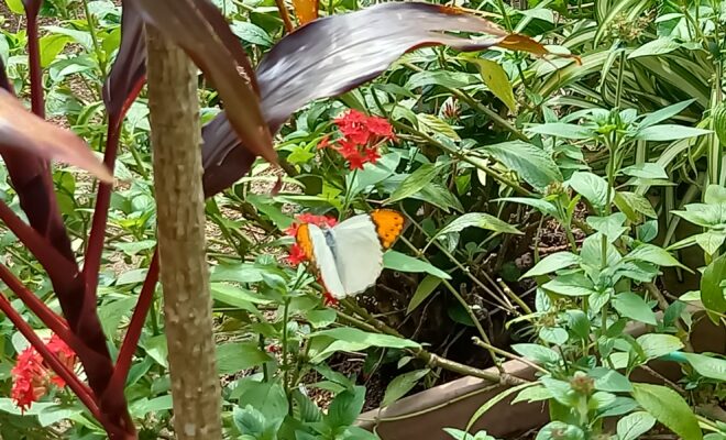 RN. 種子島の安納いもっ子 さん庭の花に蝶々が蜜を吸いに飛んできました。白い羽にオレンジ色、中種子町の蝶として親しまれている、ツマベニ蝶です。鮮やかな羽色で優雅に飛び回っています。…