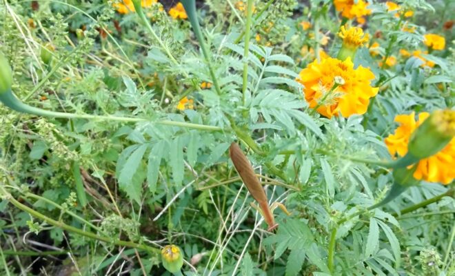 RN. 紫原ランナー さんえっちゃん、朝マリーゴールドにカマキリ発見しましたよ。黄色の花にカマキリなんだか不思議な感じでした。…