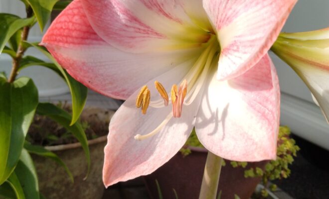 RN. 薩摩川内市ジャスミン さん玄関前の鉢植えのアマリリスが、今年も開花しました。アマリリスは、ひとつ花開くだけで、その大きさをしめしてまわりがよりにがやかに映えます。…