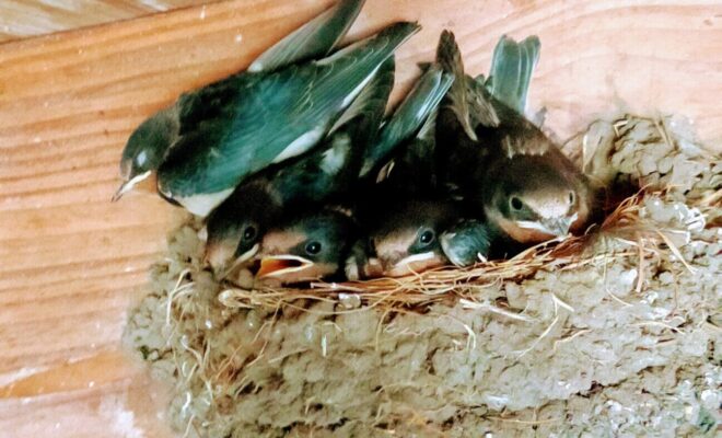 RN. 岡児ヶ水(おかちょがみず)の神社好き さん祖父の家の敷地内の牛小屋に燕が巣を作り 5羽の雛鳥が飛ぶ練習をしています! 練習の時は近くの電線にとまったり、近場を飛んでいるようです! 練習が終わったら巣に戻り親からエサを貰って…